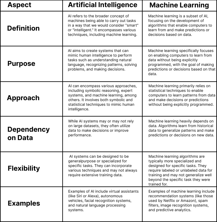 Machine Learning: Machine learning algorithms are typically more specialized and designed for specific tasks. They require labeled or unlabeled data for training and may not generalize well beyond the specific task they were trained for.